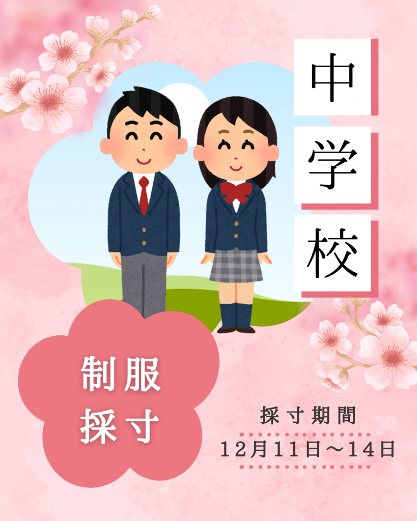 今週11日(木)より2026年度大江中学校新入生制服採寸が始まります。
